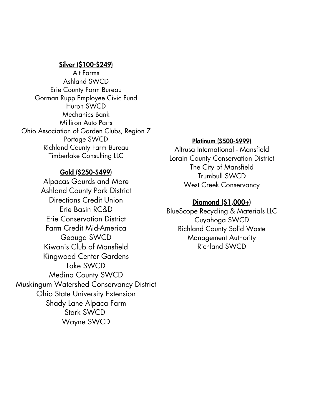 Diamond ($1,000+) BlueScope Recycling & Materials LLC Cuyahoga SWCD Richland County Solid Waste Management Authority Richland SWCD Platinum ($500-$999) Altrusa International – Mansfield Lorain Cou