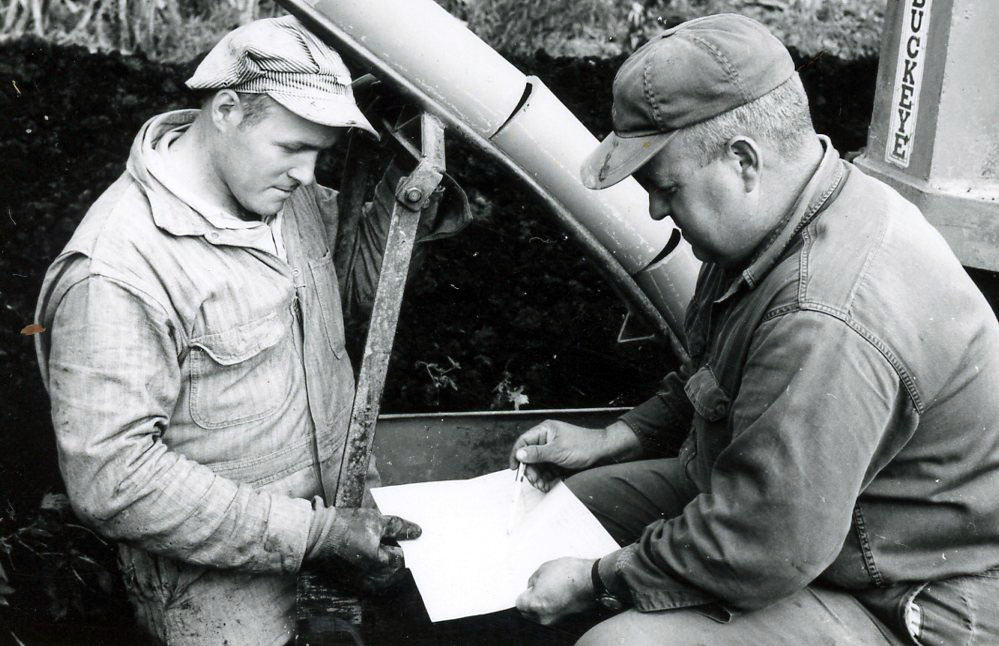 Two men studying a blueprint. Photo by Robert Mills